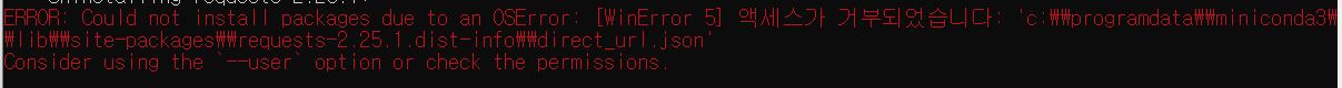 그래서 cmd 실행시 마우스 우클릭 후 '관리자 권한으로 실행' 으로 접속하여