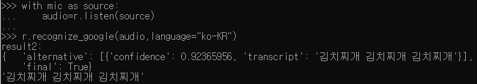 >>> r.recognize_google(audio,language="ko-KR")