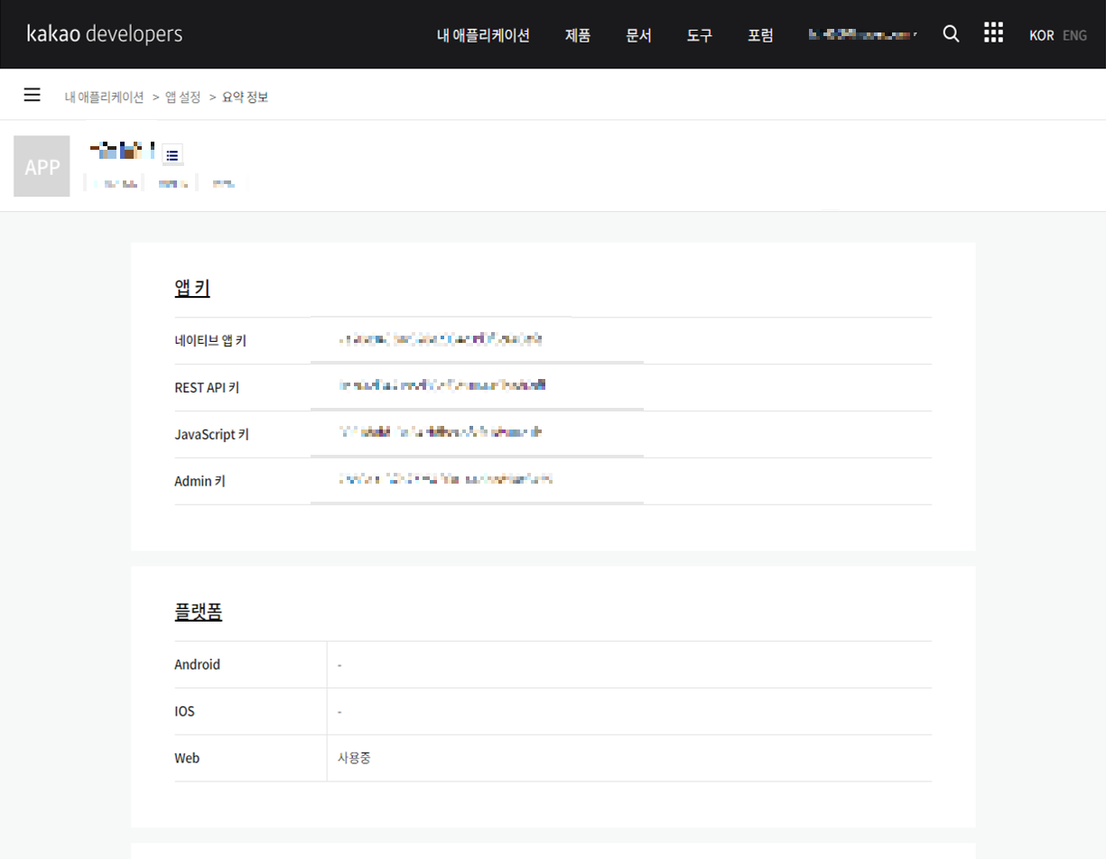 7. 내 애플리케이션 > 앱설정 > 요약정보로 접속하여, 개발환경에 따른 앱키 사용하기 (네이티브 앱, REST API, JavaSctipt, Admin)