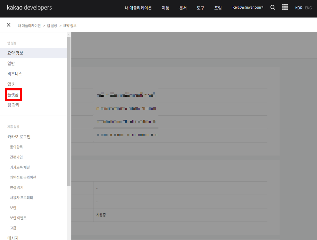 5.왼쪽 메뉴에서 내 애플리케이션 > 앱설정 > 플랫폼 클릭.