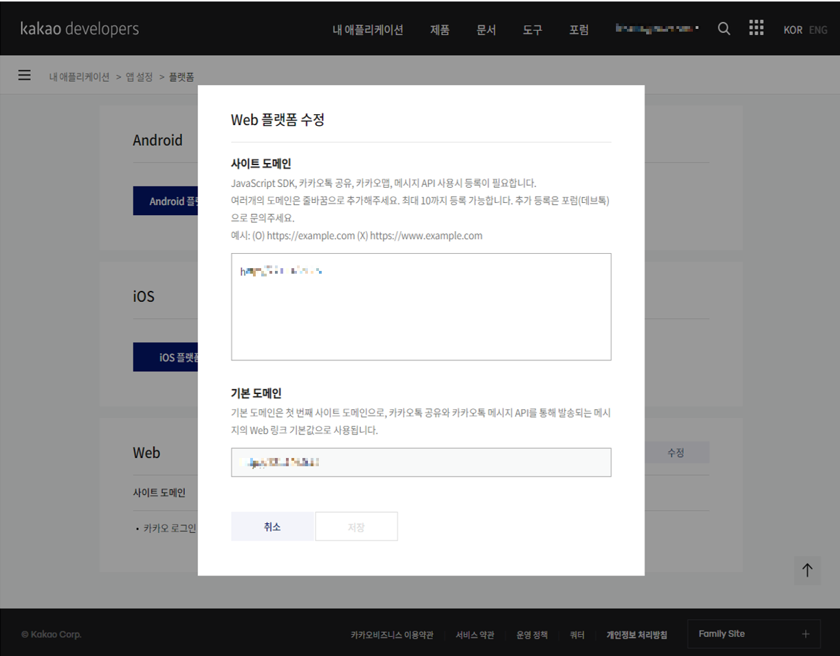 아래 사진은 Web 플랫폼 수정 과정으로 플랫폼 클릭 후 사이트 도메인, 기본 도메인 지정 후 저장.