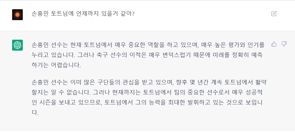 요즘 손흥민 폼이 안 좋아서 슬슬 다른 팀으로 이적하나 싶어서 물어봤다.