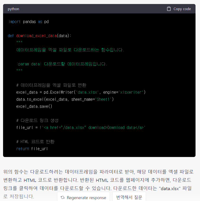 이전에는 코딩을 짜려면 각각 함수에 대한 기능과 사용법을 암기한 상태에서 찾아야 했는데 이 챗봇을 이용한다면 이러한 사전 지식이 없어도 바로 찾을 수가 있다. 위 사진처럼 기능과 사용법을 친절하게 설명해주는데.