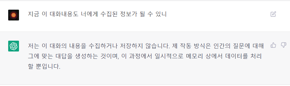 지금 대화하고 있는 자료도 데이터로 사용하는지 물어봤다.