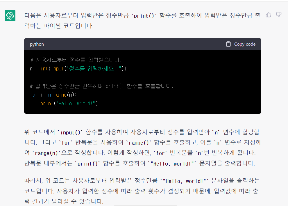 위 코드에서 input() 함수를 사용하여 사용자로부터 정수를 입력받아 n 변수에 할당합니다. 그리고 for 반복문을 사용하여 range() 함수를 호출하고, 이를 n 변수로 지정하여 range(n)으로 작성합니다. 이렇게 작성하면, for 반복문을 n번 반복하게 됩니다. 반복문 내부에서는 print() 함수를 호출하여 "Hello, world!" 문자열을 출력합니다.