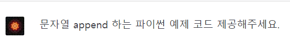 문자열 append 하는 파이썬 예제 코드 제공해주세요.