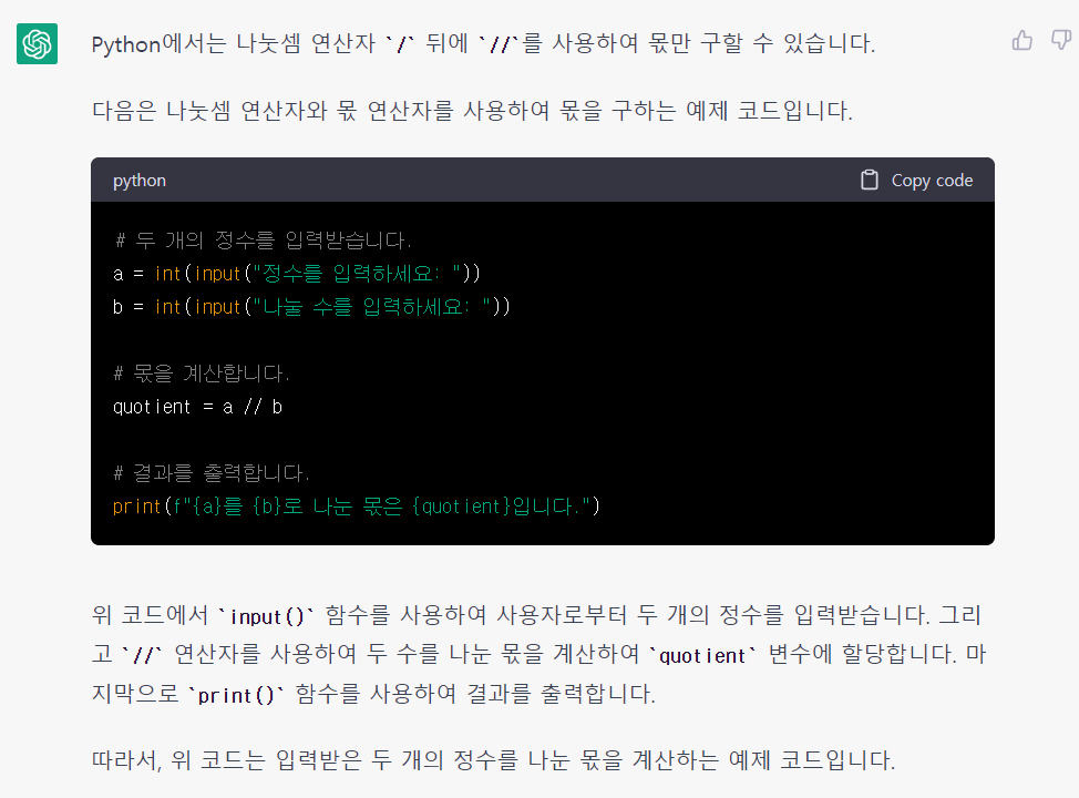 위 코드에서 input() 함수를 사용하여 사용자로부터 두 개의 정수를 입력받습니다. 그리고 // 연산자를 사용하여 두 수를 나눈 몫을 계산하여 quotient 변수에 할당합니다. 마지막으로 print() 함수를 사용하여 결과를 출력합니다.
