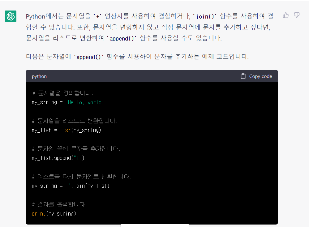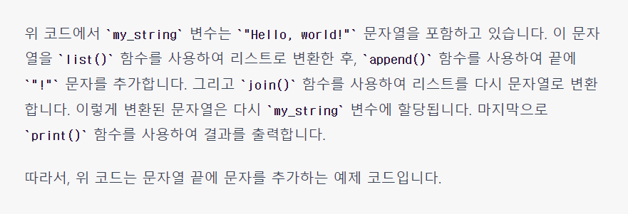 위 코드에서 my_string 변수는 "Hello, world!" 문자열을 포함하고 있습니다. 이 문자열을 list() 함수를 사용하여 리스트로 변환한 후, append() 함수를 사용하여 끝에 "!" 문자를 추가합니다. 그리고 join() 함수를 사용하여 리스트를 다시 문자열로 변환합니다. 이렇게 변환된 문자열은 다시 my_string 변수에 할당됩니다. 마지막으로 print() 함수를 사용하여 결과를 출력합니다.