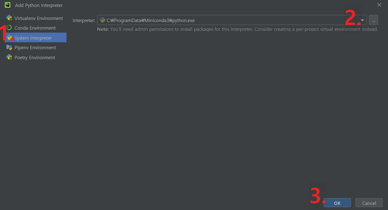 그러면 Add interpreter 팝업에서 빠져 나와