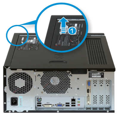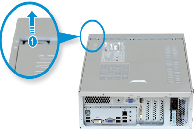 - 1. 컴퓨터 본체를 오른쪽으로 눕힌 후 바닥 면의 고정 랫치를 90˚ 들어 올린 후 앞으로 당기세요.
