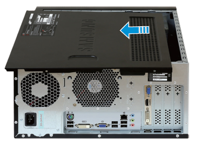 - 1. 컴퓨터를 옆으로 눕힌 후 컴퓨터 뒷면의 나사 2개를 드라이버를 이용해 제거하세요.