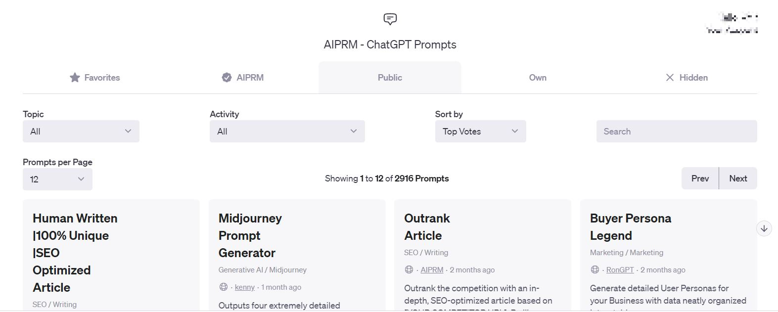여기서 상단 5개 탭이 있다. Favorites, AIPRM, Public, Own, Hidden.