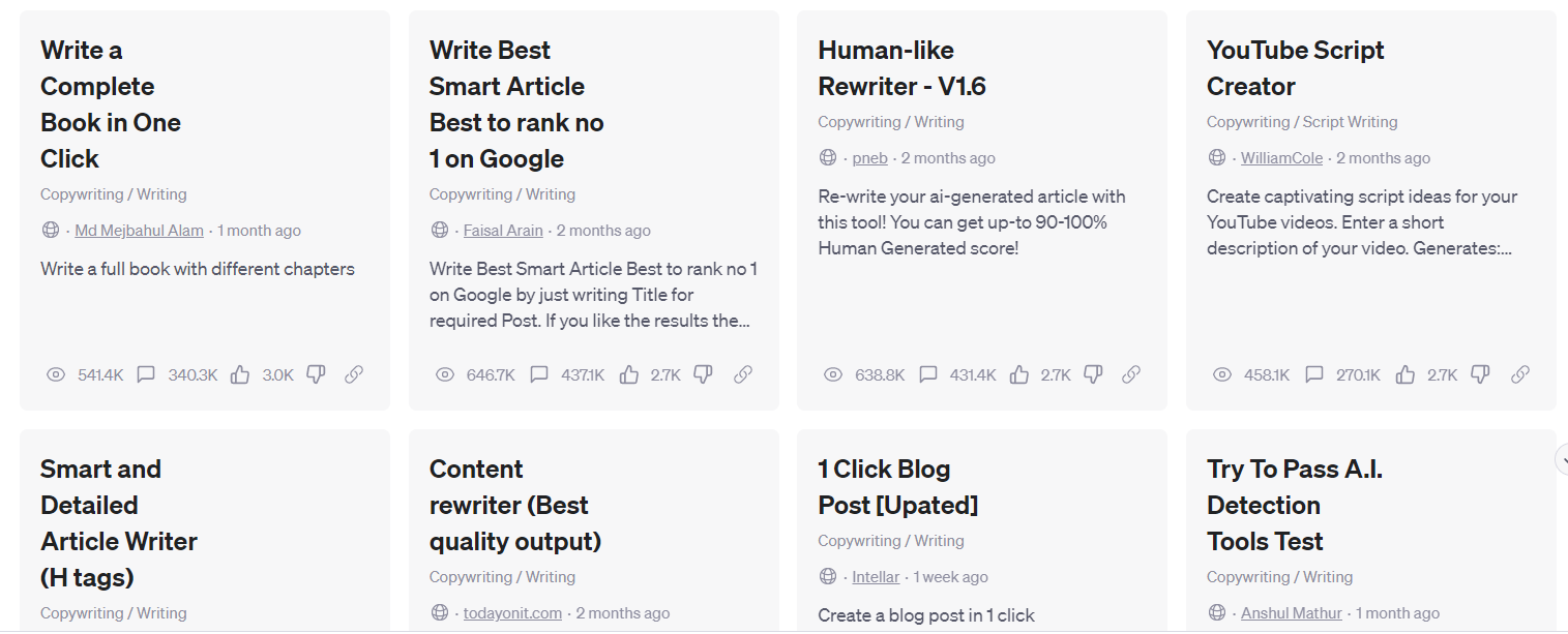 뭐가 많이 추가된 모습을 볼 수 있다. 대충 보면 AIPRM에서 선별한 인기 프롬프트들이 보인다.