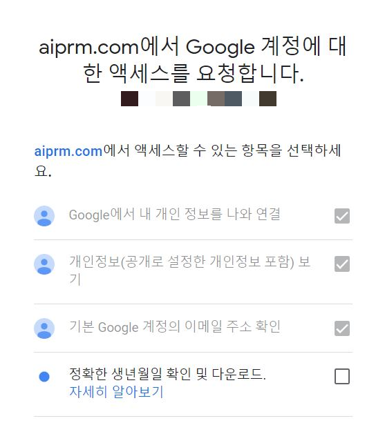 그러면 구글 계정에서 엑세스 요청하는 창이 나오는데 위의 체크표시에서 정확한 생년월일 확인 및 다운로드까지 체크 후 계속 버튼을 클릭한다.
