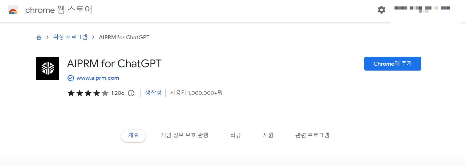 크롬 창에 AIPRM for ChatGPT를 쳐보면 구글 웹스토어에 확장프로그램으로 있는 AIPRM for ChatGPT을 발견할 수 있다.